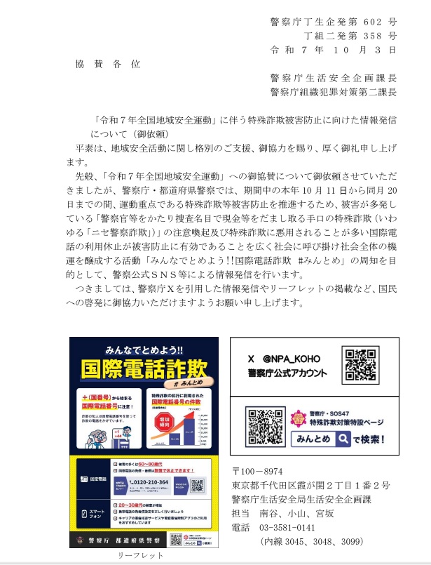 日商連を通じて警察庁から「令和7年全国地域安全運動」についての